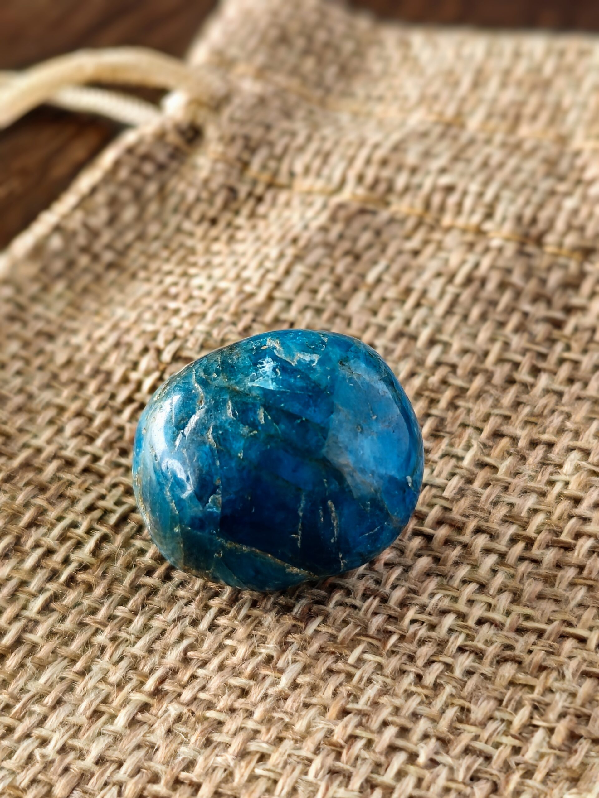 L’apatite turquoise est une pierre vive et lumineuse, parfaite pour retrouver élan, clarté mentale et ouverture du cœur. Sa couleur bleue aux reflets tropicaux évoque l’eau en mouvement, le ciel dégagé, l’inspiration fluide. C’est une pierre idéale pour celles et ceux qui ont besoin de retrouver leur voix, d’exprimer plus clairement ce qu’ils ressentent ou de raviver leur motivation intérieure.