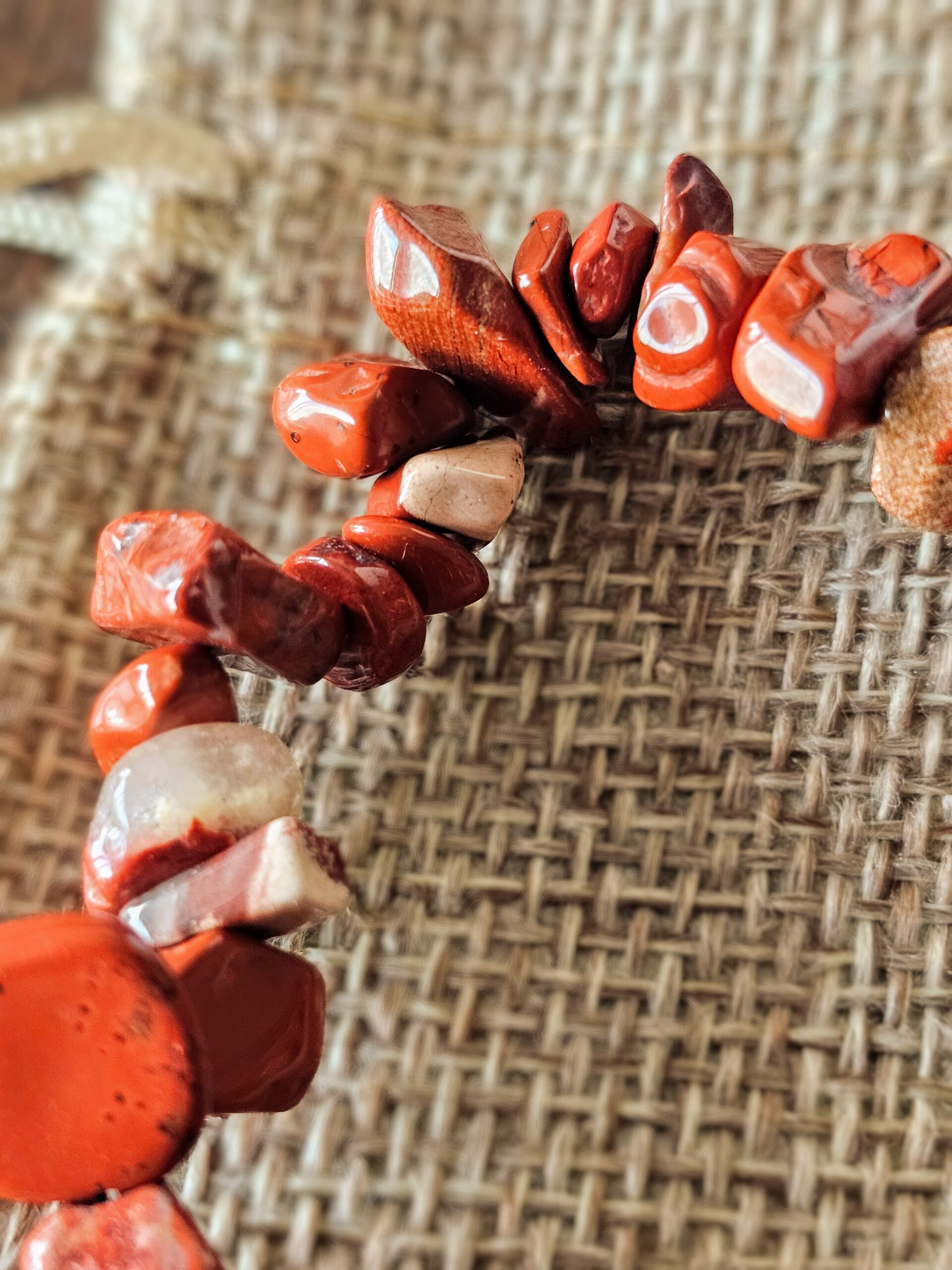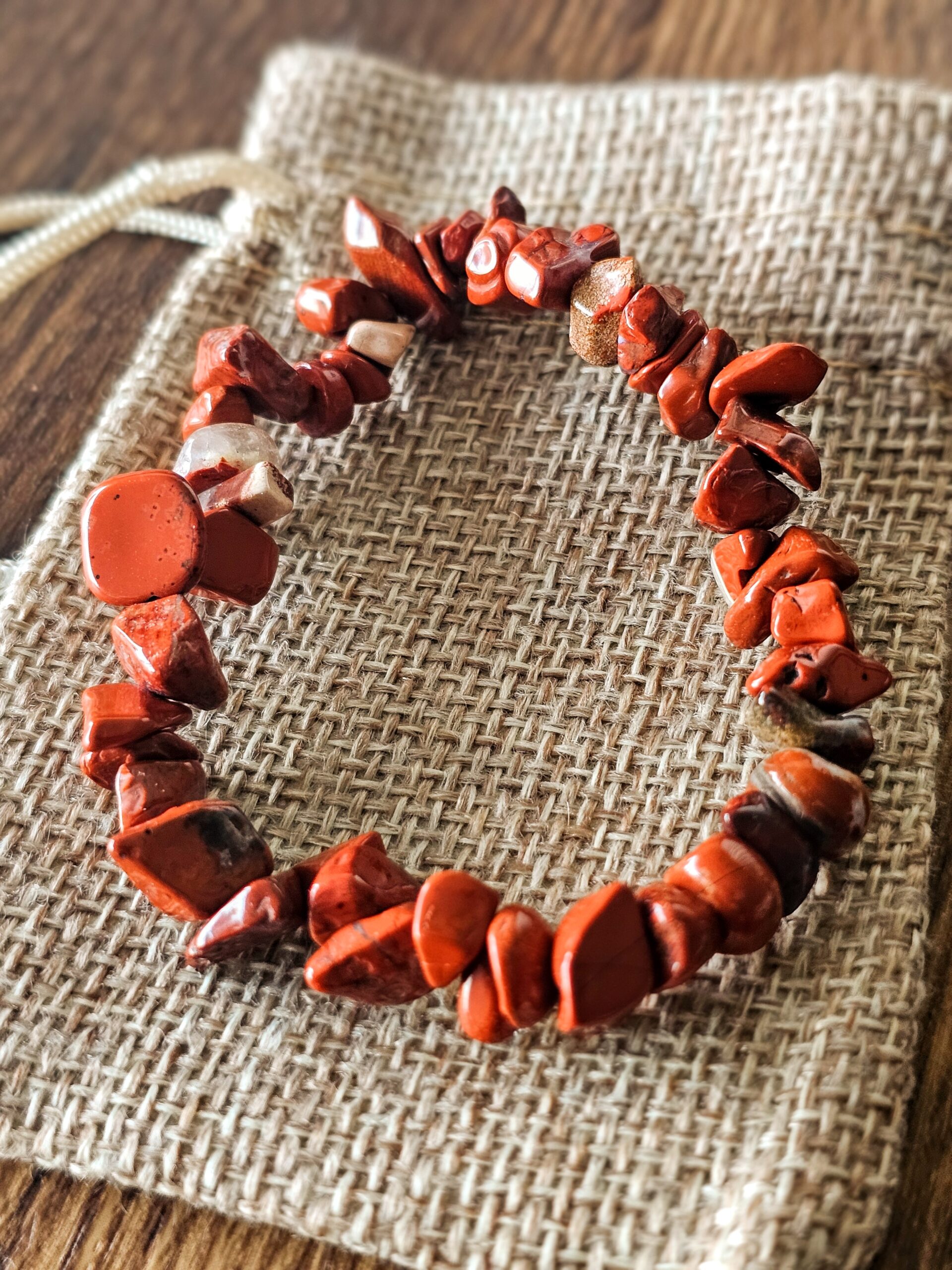 Pierre du chakra racine, le jaspe rouge favorise la persévérance, la combativité et la réalisation concrète de tes projets. Il encourage à passer à l’action avec courage et détermination, sans pour autant perdre de vue ses besoins fondamentaux. Le bracelet en jaspe rouge brut est idéal si tu traverses une période de fatigue, de doute ou de dispersion : il t’aidera à poser les pieds au sol, à retrouver ton rythme naturel et à aller de l’avant avec assurance.