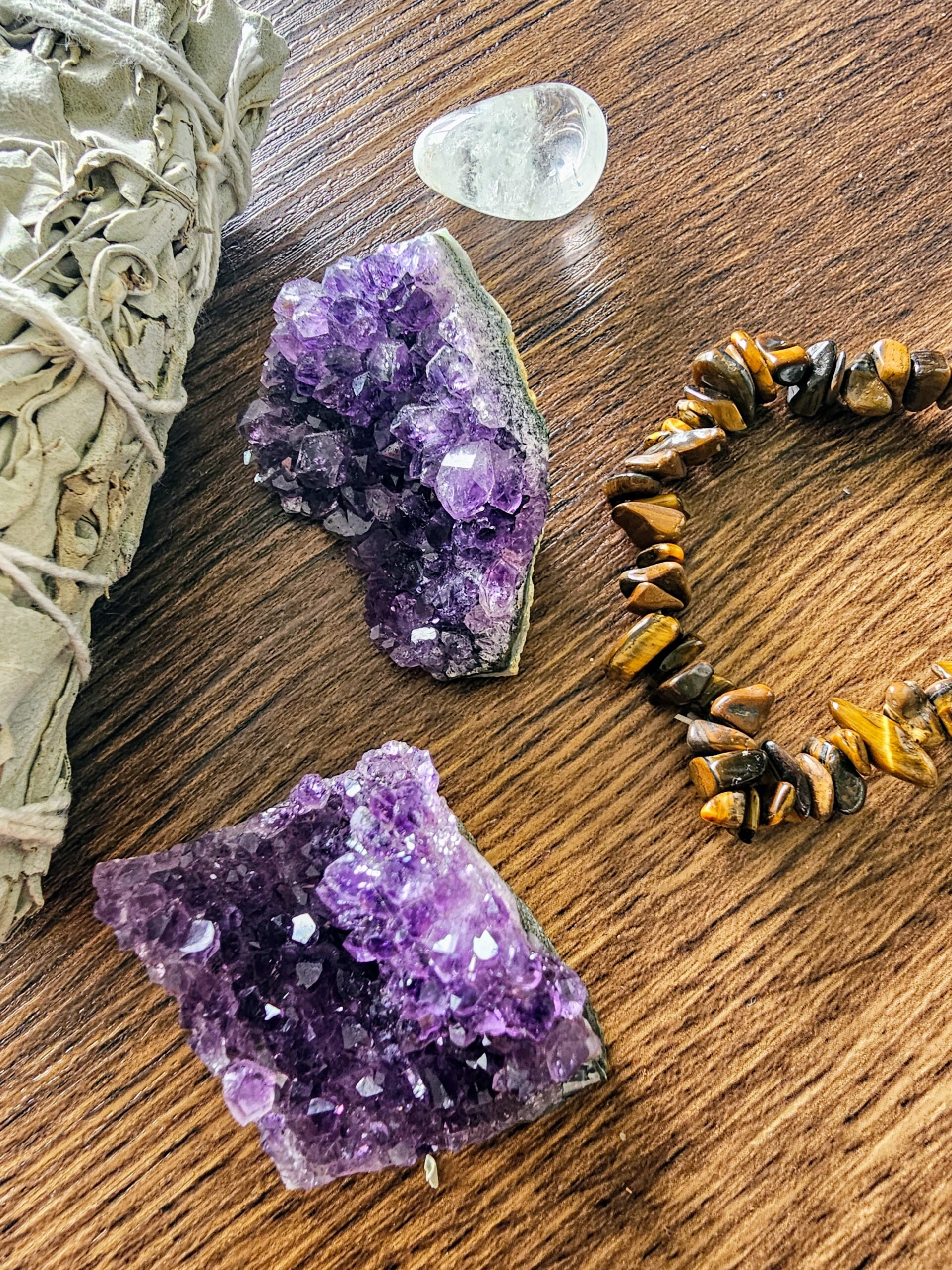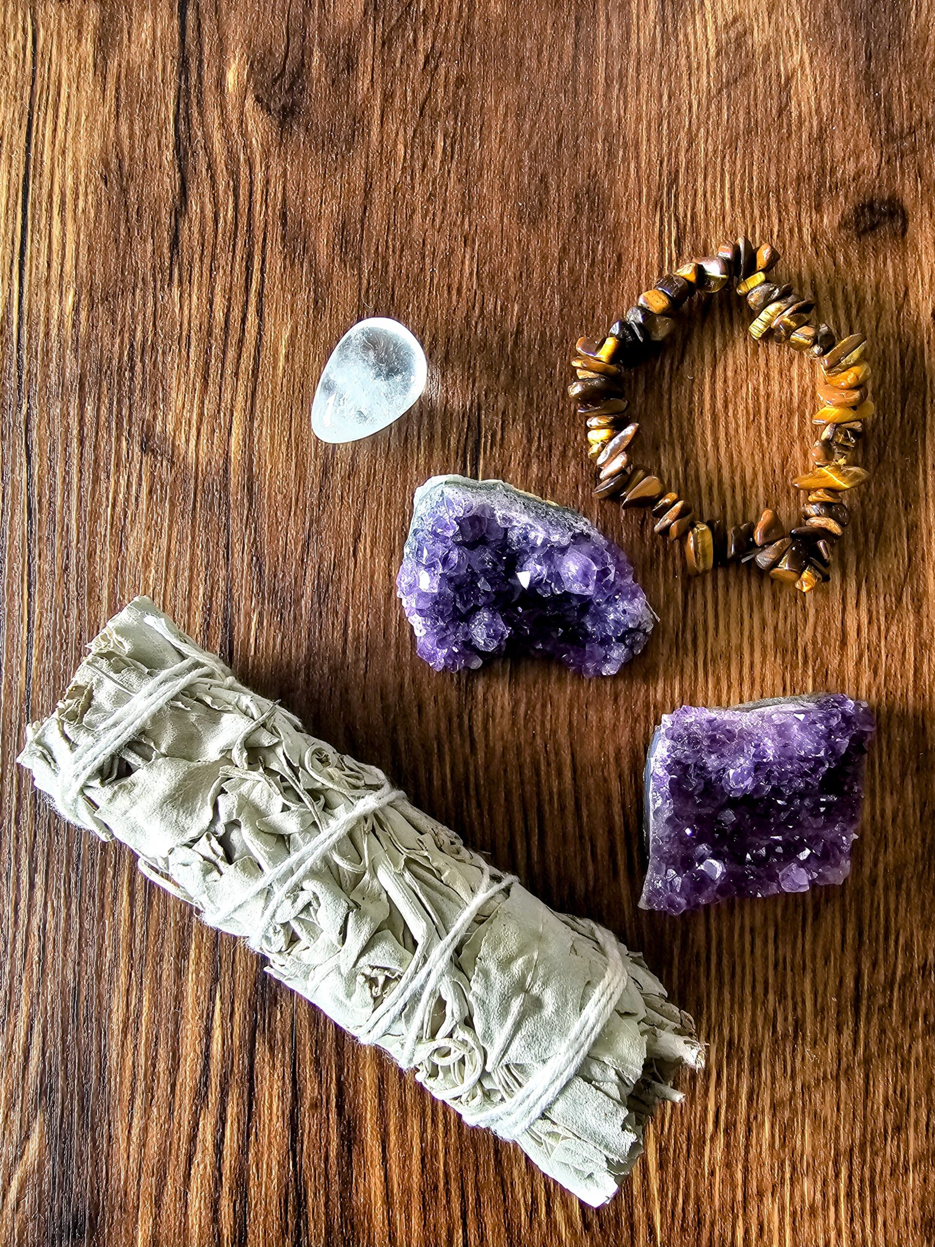 Kit d’ancrage et purification – sauge blanche, améthystes, quartz blanc et œil de tigre pour un nettoyage énergétique complet et un ancrage profond.